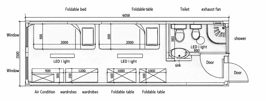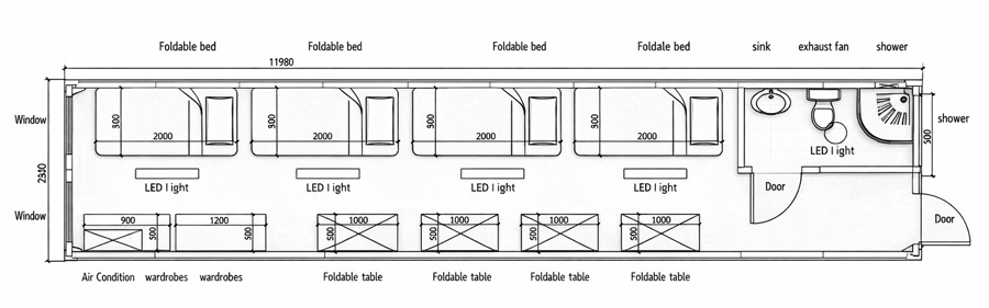 - Hygiene units with integrated shower and latrine facilities